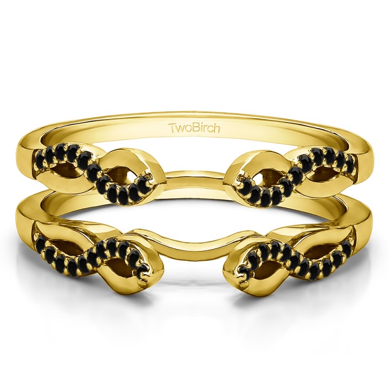 This wedding ring guard has 44 round, prong set stones. Each band measures 2 millimeters wide. This ring guard has 0.22 carats total weight.