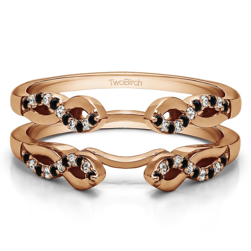 This wedding ring guard has 44 round, prong set stones. Each band measures 2 millimeters wide. This ring guard has 0.22 carats total weight.