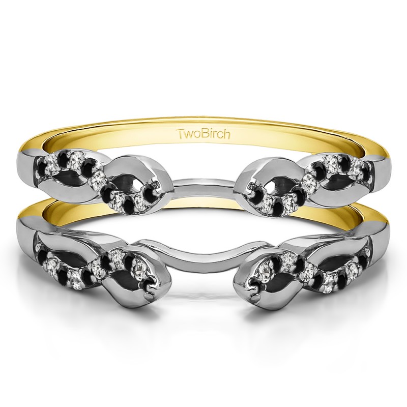 This wedding ring guard has 44 round, prong set stones. Each band measures 2 millimeters wide. This ring guard has 0.22 carats total weight.