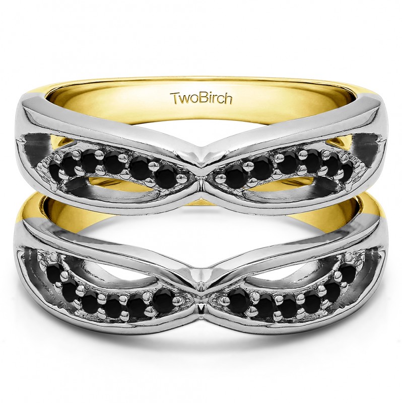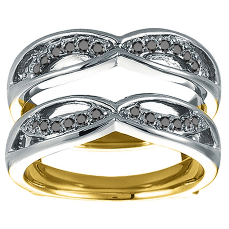 This wedding ring guard has 24 round, channel set stones. Each band measures 2.5 millimeters wide. This ring guard has 0.24 carats total weight. It is made to fit a round or princess cut solitaire from 0.25 carats to 2 carats.