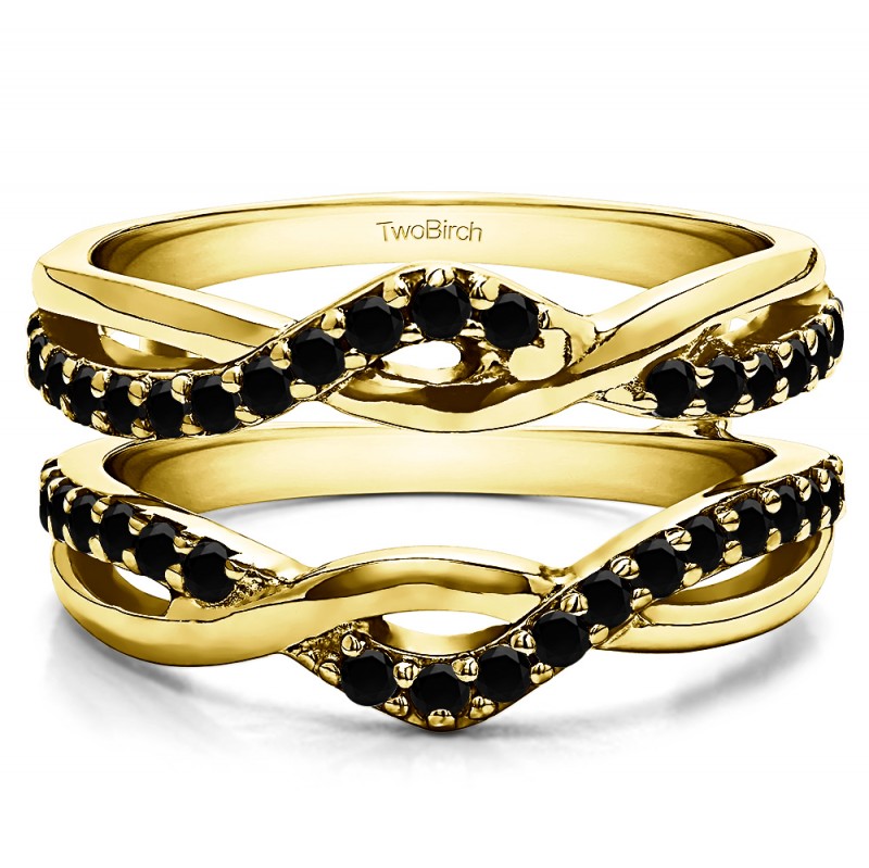 This wedding ring guard has 58 round, prong set stones. Each band measures 2.2 millimeters wide. This ring guard has 0.24 carats total weight. It is made to fit a round or princess solitaire from 1 carats to 1.5, or a princess cut solitaire from 0.75 up to 2 carats.