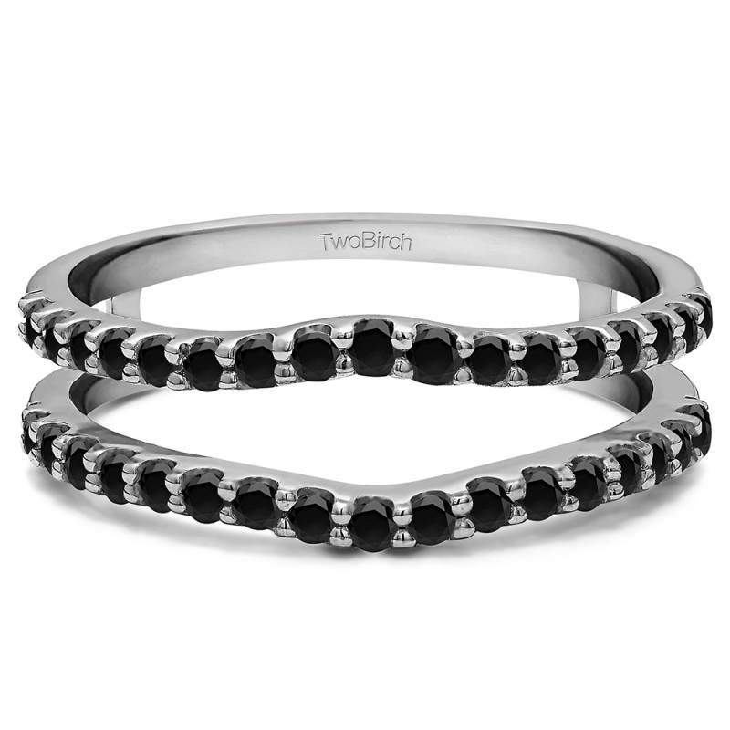 This wedding ring guard has 34 round, prong set stones. Each band measures 1.7 millimeters wide. This ring guard has 0.24 carats total weight. It is made to fit a round solitaire from 0.25 carats to 2, or a princess cut solitaire from 0.25 up to 0.5 carats.