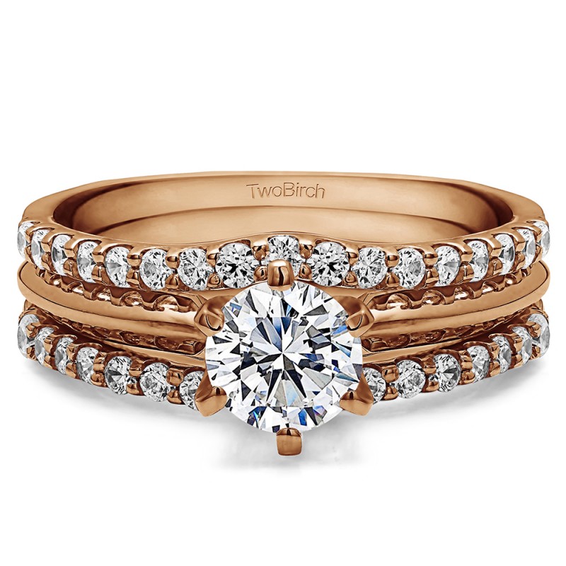 This wedding ring guard has 34 round, prong set stones. Each band measures 1.7 millimeters wide. This ring guard has 0.24 carats total weight. It is made to fit a round solitaire from 0.25 carats to 2, or a princess cut solitaire from 0.25 up to 0.5 carats.