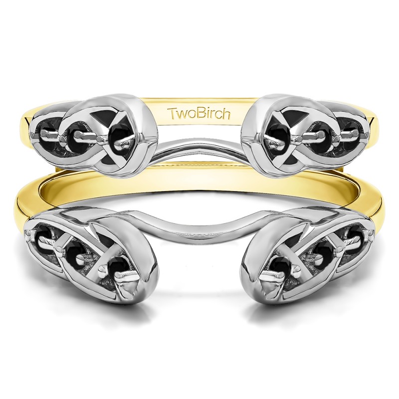 This wedding ring guard has 12 round, channel set stones. Each band measures 2 millimeters wide. This ring guard has 0.24 carats total weight.