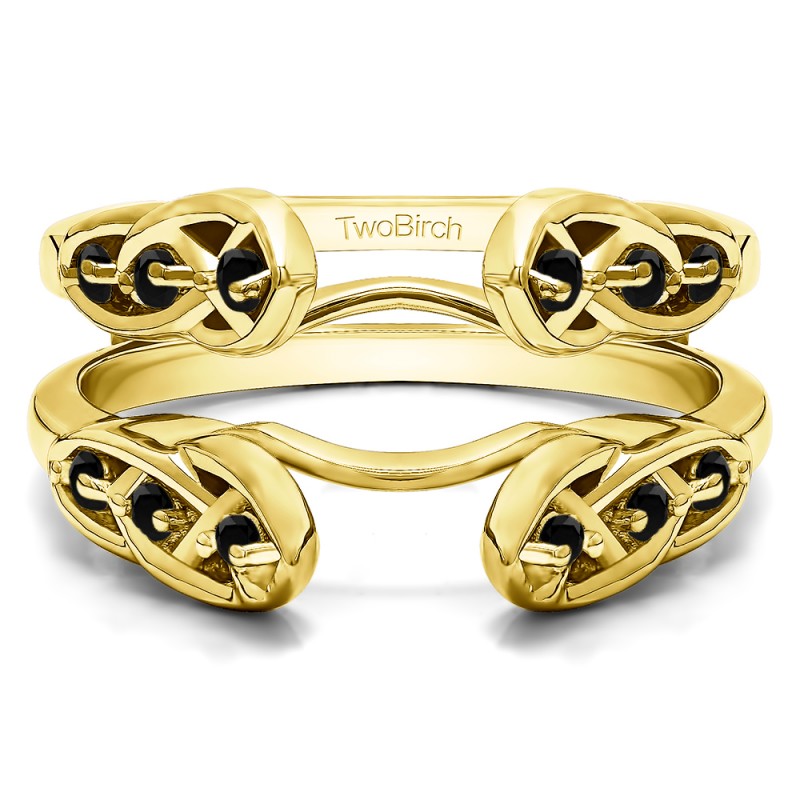 This wedding ring guard has 12 round, channel set stones. Each band measures 2 millimeters wide. This ring guard has 0.24 carats total weight.