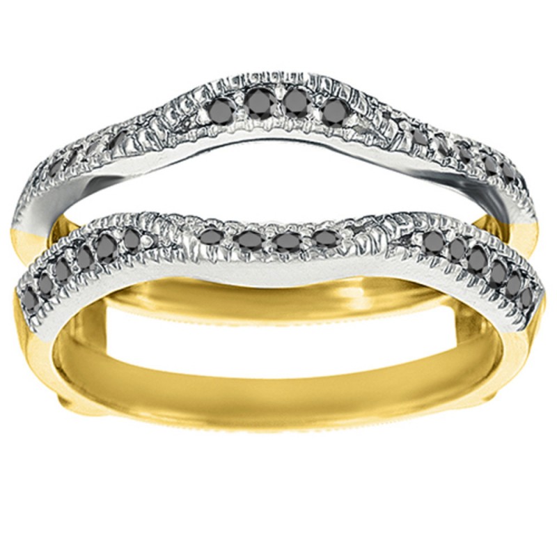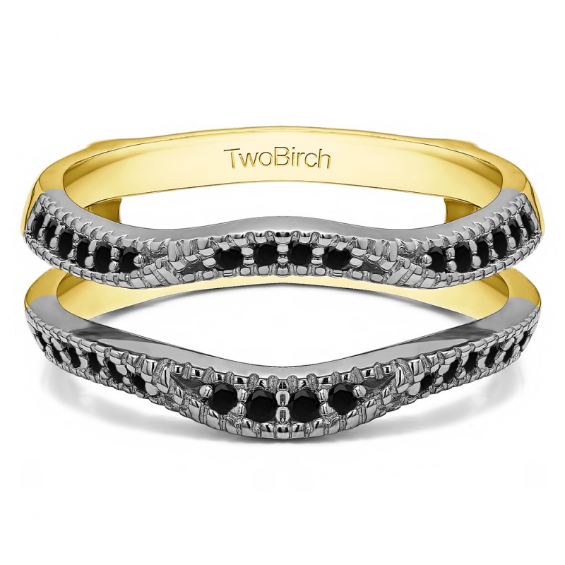 This wedding ring guard has 32 round, prong set stones. Each band measures 2.6 millimeters wide. This ring guard has 0.24 carats total weight. It is made to fit a round solitaire from 0.5 carats to 2, or a princess cut solitaire from 0.25 up to 2 carats.