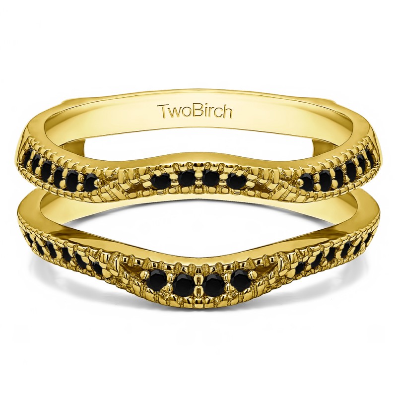 This wedding ring guard has 32 round, prong set stones. Each band measures 2.6 millimeters wide. This ring guard has 0.24 carats total weight. It is made to fit a round solitaire from 0.5 carats to 2, or a princess cut solitaire from 0.25 up to 2 carats.