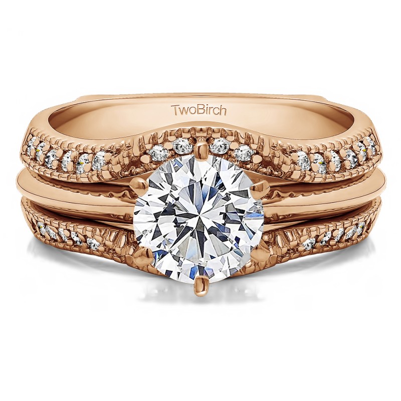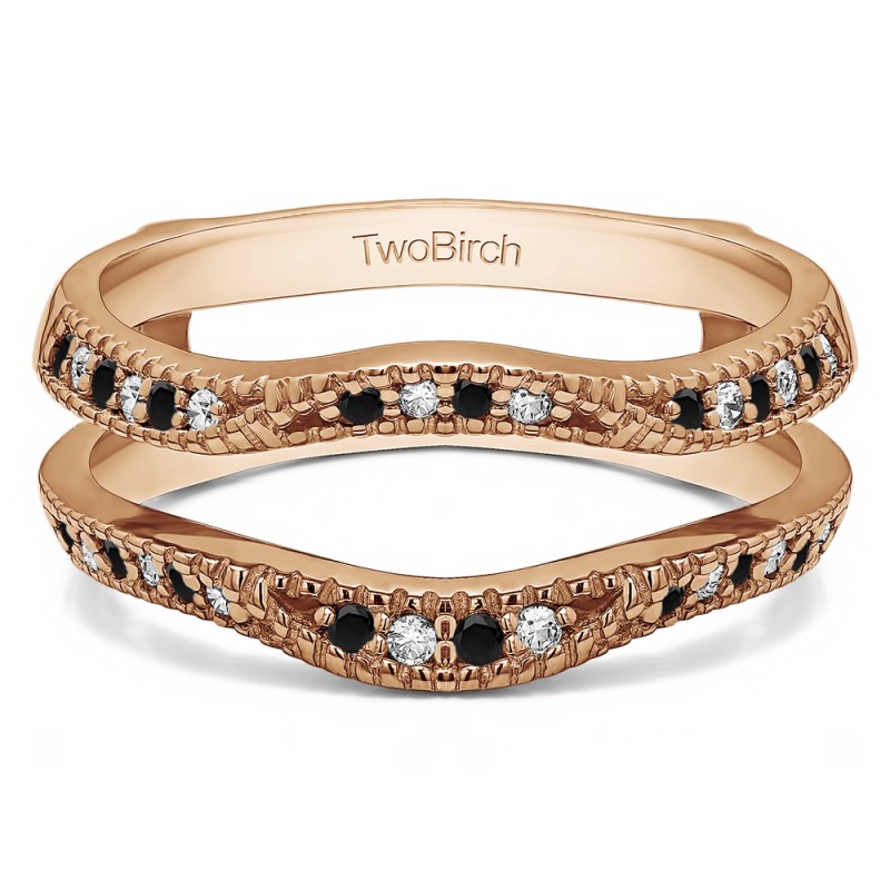 This wedding ring guard has 32 round, prong set stones. Each band measures 2.6 millimeters wide. This ring guard has 0.24 carats total weight. It is made to fit a round solitaire from 0.5 carats to 2, or a princess cut solitaire from 0.25 up to 2 carats.
