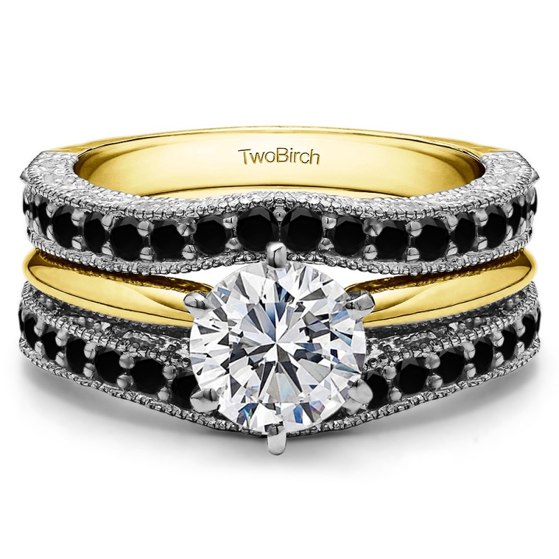 This wedding ring guard has 52 round, channel set stones. Each band measures 2 millimeters wide. This ring guard has 0.26 carats total weight. It is made to fit a round, princess, or marquise cut solitaire from 0.25 carats to 1 carats.