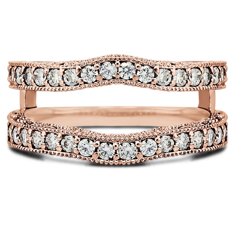 This wedding ring guard has 52 round, channel set stones. Each band measures 2 millimeters wide. This ring guard has 0.26 carats total weight. It is made to fit a round, princess, or marquise cut solitaire from 0.25 carats to 1 carats.