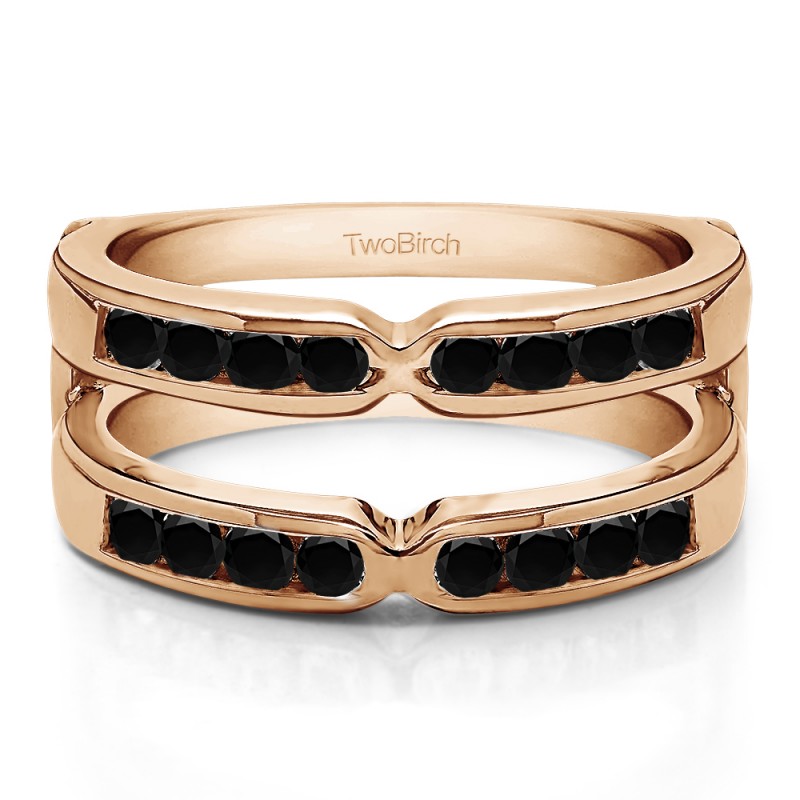 This wedding ring guard has 24 round, channel set stones. Each band measures 1.8 millimeters wide. This ring guard has 0.26 carats total weight. It is made to fit a round solitaire from 0.2 carats to 0.45, or a princess cut solitaire from 0.2 up to 0.75, or a marquise solitaire from 0.25 up to 0.5 carats.
