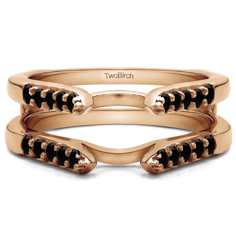 This wedding ring guard has 20 round, prong set stones. Each band measures 2 millimeters wide. This ring guard has 0.3 carats total weight. It is made to fit a round solitaire from 0.5 carats to 1, or a princess or marquise cut solitaire from .50 carats up to .75 carats.