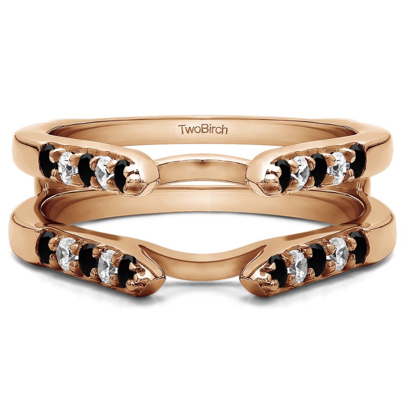 This wedding ring guard has 20 round, prong set stones. Each band measures 2 millimeters wide. This ring guard has 0.3 carats total weight. It is made to fit a round solitaire from 0.5 carats to 1, or a princess or marquise cut solitaire from .50 carats up to .75 carats.