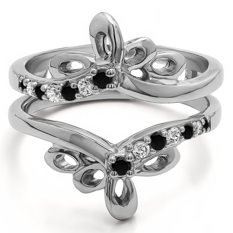 This wedding ring guard has 14 round, prong set stones. Each band measures 2.66 millimeters wide. This ring guard has 0.3 carats total weight. It is made to fit a round or princess cut solitaire from 0.25 carats to 2 carats.
