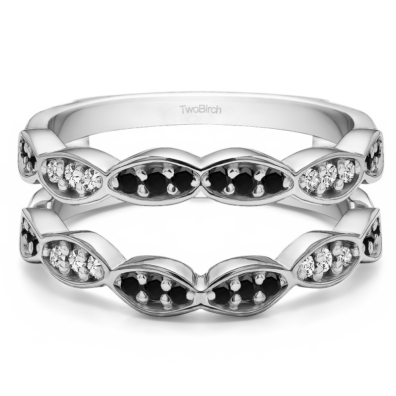 This wedding ring guard has 36 round, prong set stones. Each band measures 2.28 millimeters wide. This ring guard has 0.3 carats total weight. It is made to fit a round or marquise cut solitaire from 0.5 carats to 1.5, or a princess cut solitaire from 0.5 up to 2 carats.