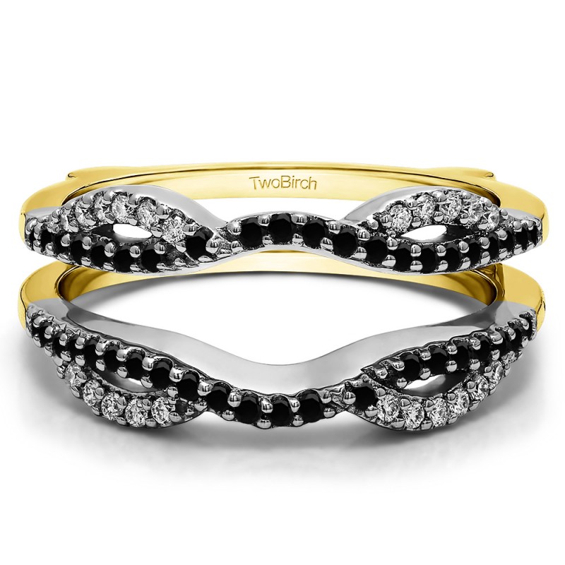 This wedding ring guard has 64 round, prong set stones. Each band measures 2 millimeters wide. This ring guard has 0.32 carats total weight.