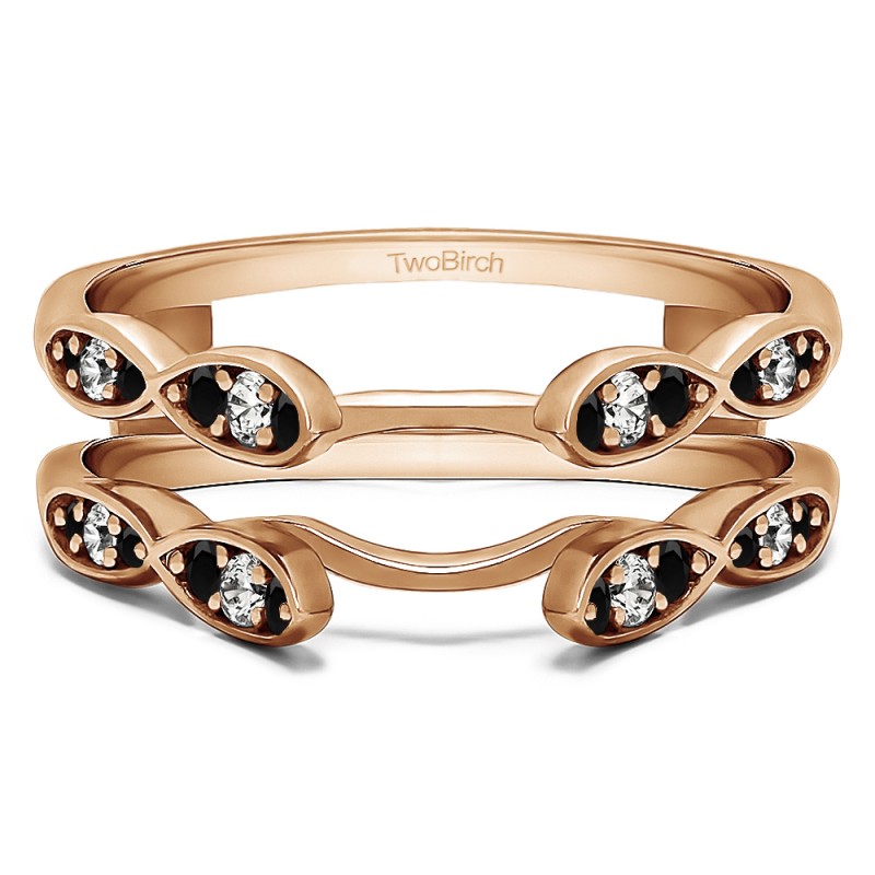 This wedding ring guard has 24 round, channel set stones. Each band measures 2 millimeters wide. This ring guard has 0.32 carats total weight.