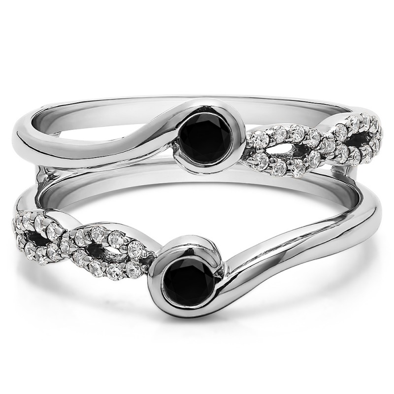 This wedding ring guard has 38 round, prong set stones. Each band measures 2 millimeters wide. This ring guard has 0.34 carats total weight.