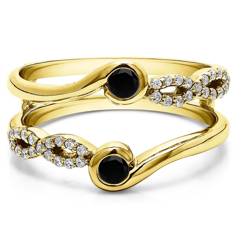 This wedding ring guard has 38 round, prong set stones. Each band measures 2 millimeters wide. This ring guard has 0.34 carats total weight.