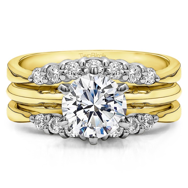 This wedding ring guard has 14 round, prong set stones. Each band measures 2 millimeters wide. This ring guard has 0.35 carats total weight.