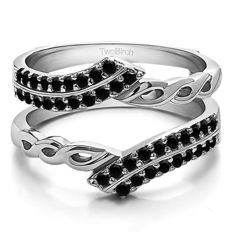 This wedding ring guard has 38 round, prong set stones. Each band measures 2.55 millimeters wide. This ring guard has 0.38 carats total weight. It is made to fit a round or princess cut solitaire from 0.5 carats to 2, or a marquise solitaire from 0.5 up to 1.5 carats.