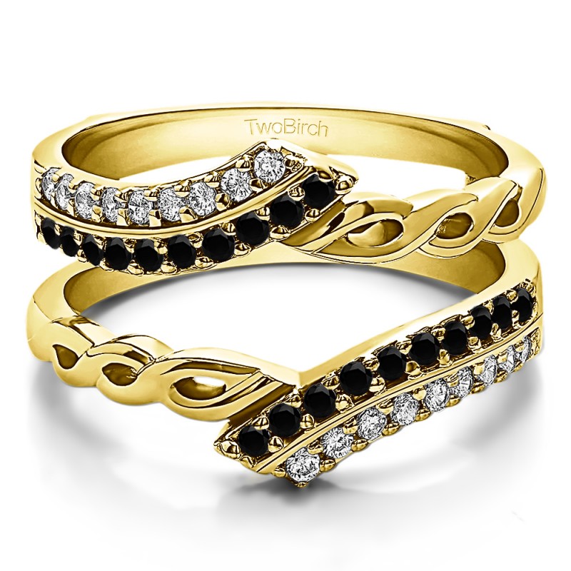 This wedding ring guard has 38 round, prong set stones. Each band measures 2.55 millimeters wide. This ring guard has 0.38 carats total weight. It is made to fit a round or princess cut solitaire from 0.5 carats to 2, or a marquise solitaire from 0.5 up to 1.5 carats.