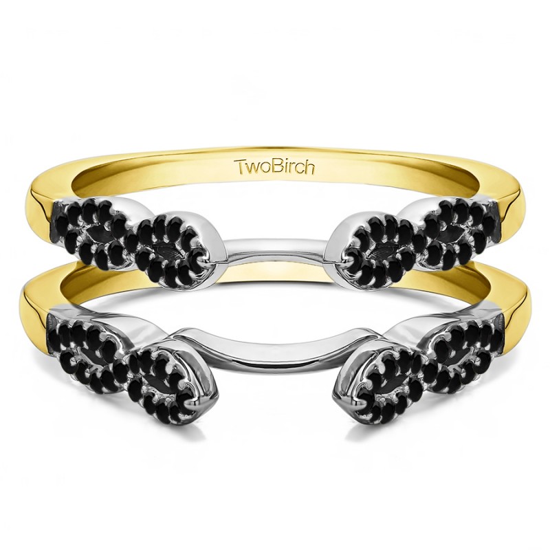 This wedding ring guard has 76 round, prong set stones. Each band measures 2 millimeters wide. This ring guard has 0.38 carats total weight.