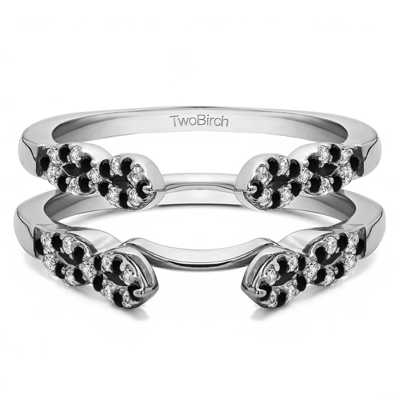 This wedding ring guard has 76 round, prong set stones. Each band measures 2 millimeters wide. This ring guard has 0.38 carats total weight.