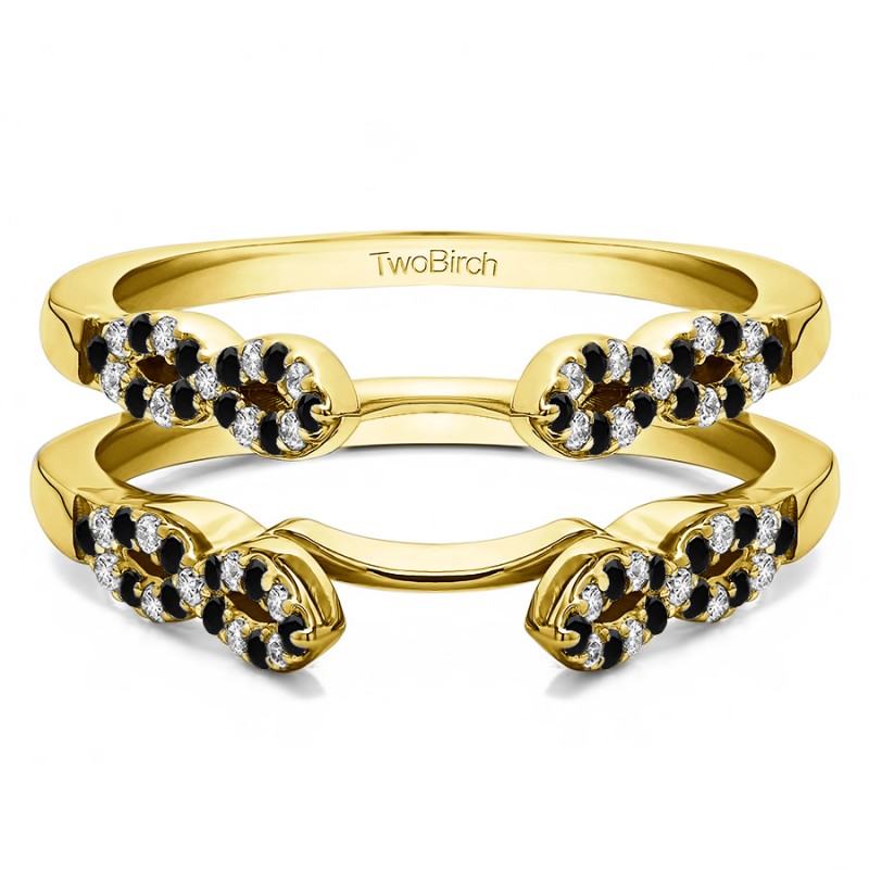 This wedding ring guard has 76 round, prong set stones. Each band measures 2 millimeters wide. This ring guard has 0.38 carats total weight.