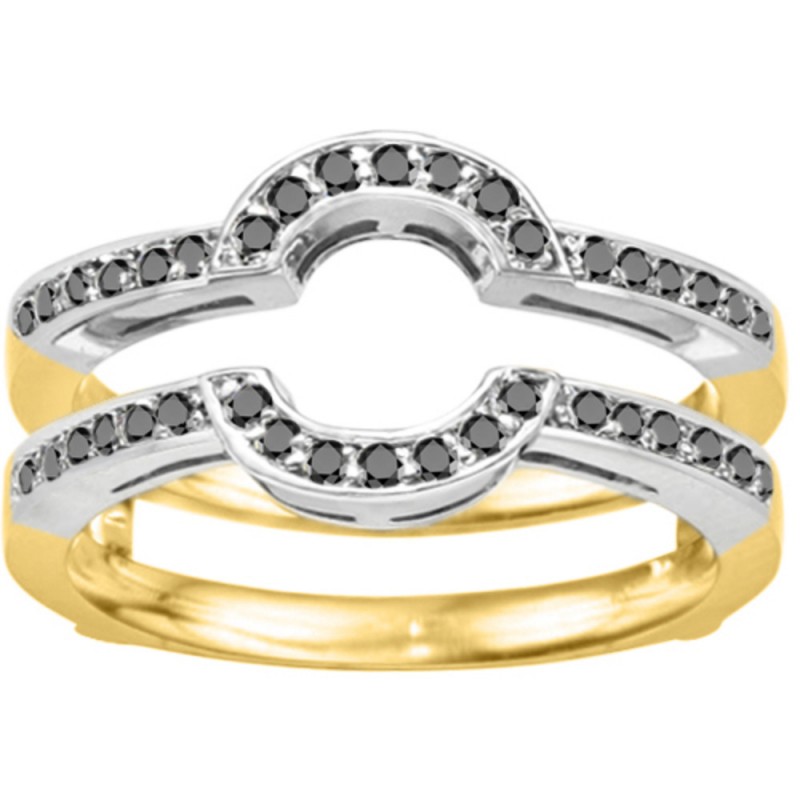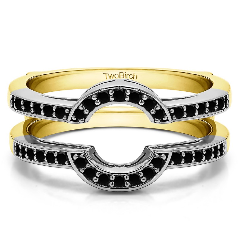 This wedding ring guard has 38 round, channel set stones. Each band measures 2 millimeters wide. This ring guard has 0.38 carats total weight. It is made to fit a round solitaire from 0.5 carats to 1 carats.