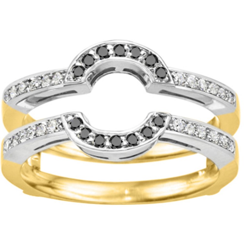 This wedding ring guard has 38 round, channel set stones. Each band measures 2 millimeters wide. This ring guard has 0.38 carats total weight. It is made to fit a round solitaire from 0.5 carats to 1 carats.