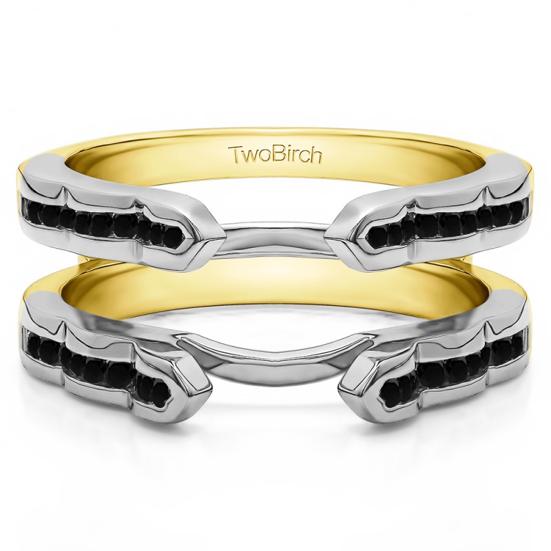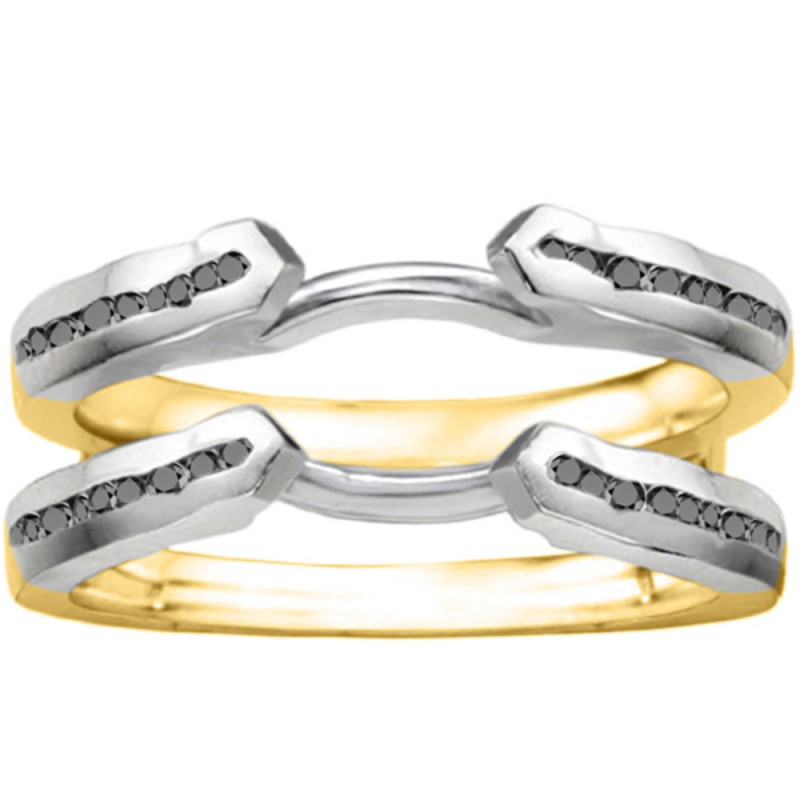 This wedding ring guard has 40 round, channel set stones. Each band measures 2 millimeters wide. This ring guard has 0.4 carats total weight. It is made to fit a round or marquise cut solitaire from 0.5 carats to 2, or a princess cut solitaire from 0.75 up to 2 carats.