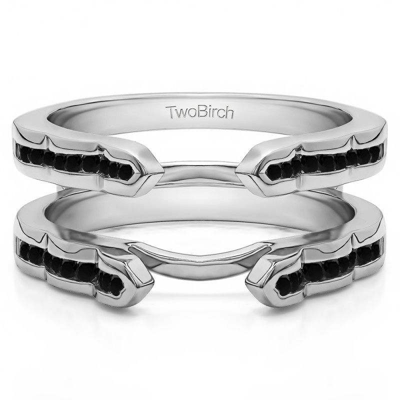 This wedding ring guard has 40 round, channel set stones. Each band measures 2 millimeters wide. This ring guard has 0.4 carats total weight. It is made to fit a round or marquise cut solitaire from 0.5 carats to 2, or a princess cut solitaire from 0.75 up to 2 carats.