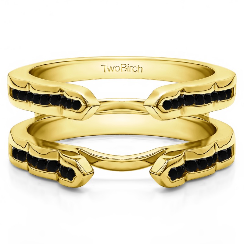 This wedding ring guard has 40 round, channel set stones. Each band measures 2 millimeters wide. This ring guard has 0.4 carats total weight. It is made to fit a round or marquise cut solitaire from 0.5 carats to 2, or a princess cut solitaire from 0.75 up to 2 carats.