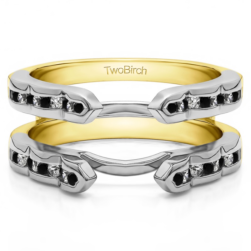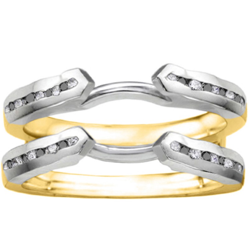 This wedding ring guard has 40 round, channel set stones. Each band measures 2 millimeters wide. This ring guard has 0.4 carats total weight. It is made to fit a round or marquise cut solitaire from 0.5 carats to 2, or a princess cut solitaire from 0.75 up to 2 carats.