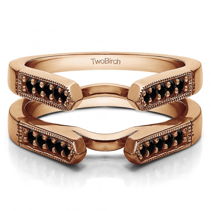 This wedding ring guard has 20 round, channel set stones. Each band measures 2.1 millimeters wide. This ring guard has 0.4 carats total weight. It is made to fit a round, marquise, or princess cut solitaire from 0.75 carats to 2 carats.