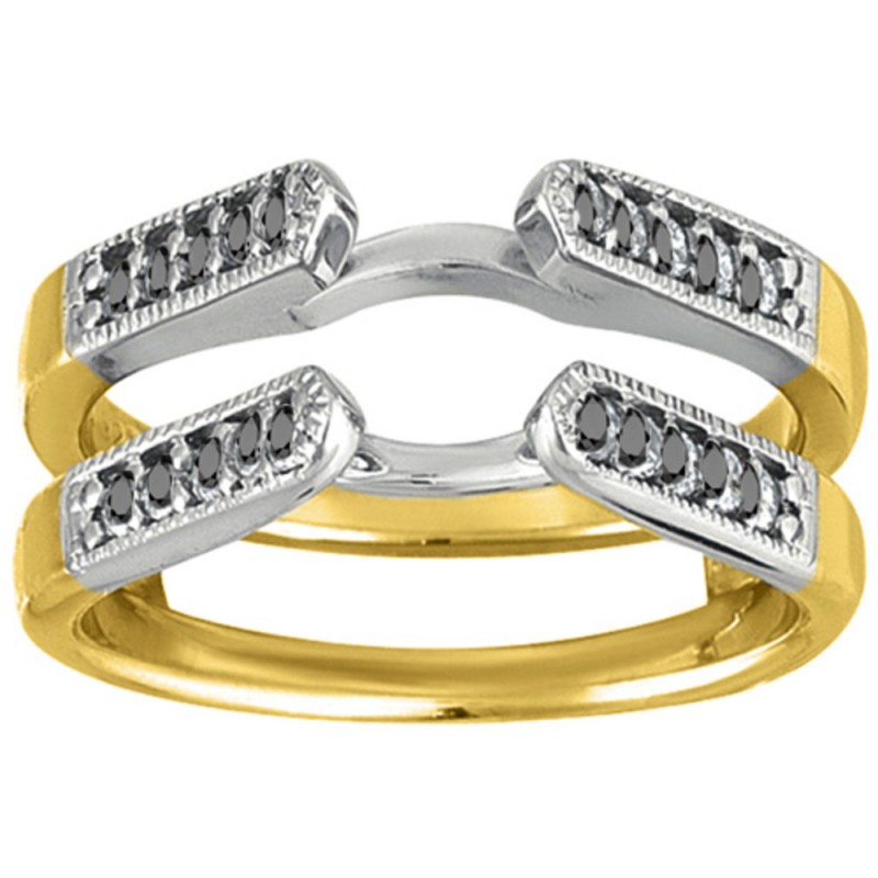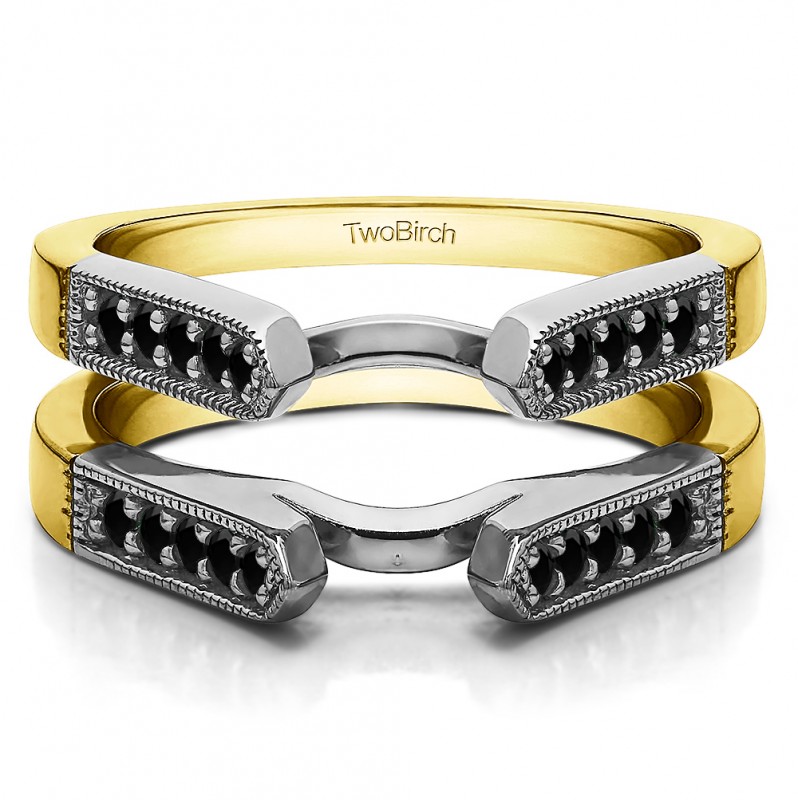 This wedding ring guard has 20 round, channel set stones. Each band measures 2.1 millimeters wide. This ring guard has 0.4 carats total weight. It is made to fit a round, marquise, or princess cut solitaire from 0.75 carats to 2 carats.