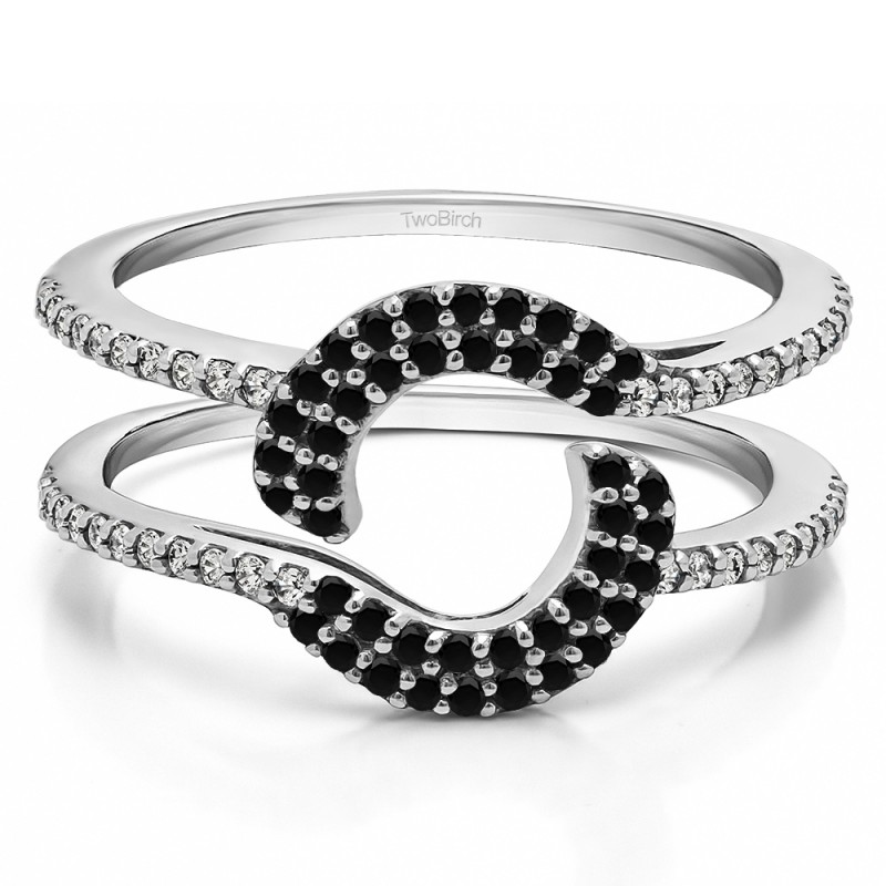 This wedding ring guard has 86 round, prong set stones. Each band measures 2 millimeters wide. This ring guard has 0.44 carats total weight. It is made to fit a round or princess cut solitaire from 0.25 carats to 1.5, or a marquise solitaire from 0.25 up to 0.5 carats.