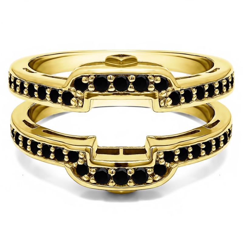 This wedding ring guard has 40 round, channel set stones. Each band measures 2.2 millimeters wide. This ring guard has 0.5 carats total weight. It is made to fit a round solitaire from 0.25 carats to 2, or a princess cut solitaire from 0.5 up to 2 carats.