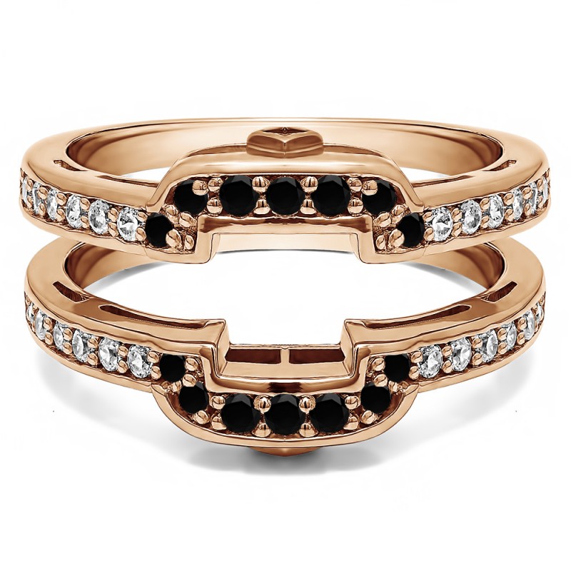 This wedding ring guard has 40 round, channel set stones. Each band measures 2.2 millimeters wide. This ring guard has 0.5 carats total weight. It is made to fit a round solitaire from 0.25 carats to 2, or a princess cut solitaire from 0.5 up to 2 carats.