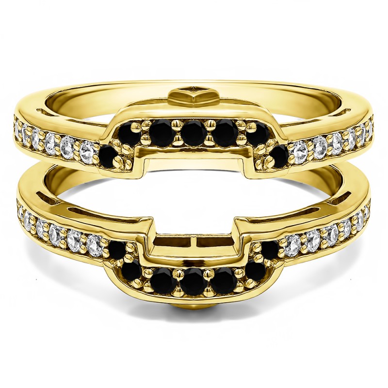This wedding ring guard has 40 round, channel set stones. Each band measures 2.2 millimeters wide. This ring guard has 0.5 carats total weight. It is made to fit a round solitaire from 0.25 carats to 2, or a princess cut solitaire from 0.5 up to 2 carats.