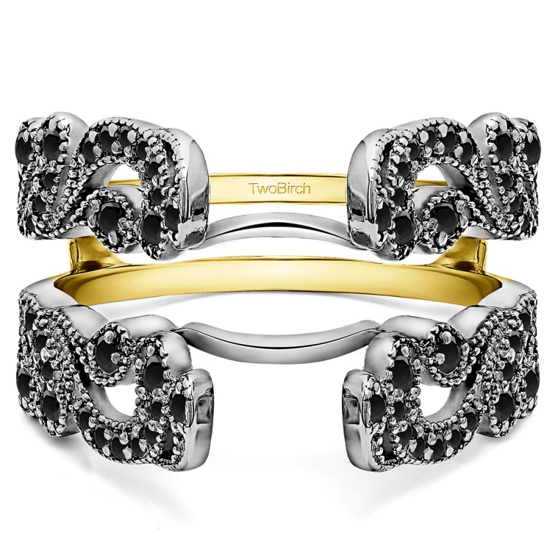 This wedding ring guard has 56 round, prong set stones. Each band measures 2 millimeters wide. This ring guard has 0.5 carats total weight.