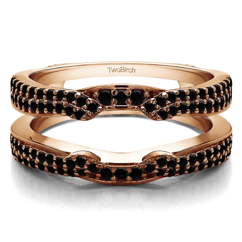 This wedding ring guard has 94 round, prong set stones. Each band measures 2.22 millimeters wide. This ring guard has 0.5 carats total weight. It is made to fit a round solitaire from 0.5 carats to 1.5, or a princess cut solitaire from 0.5 up to 2, or a marquise solitaire from 0.75 up to 1.5 carats.