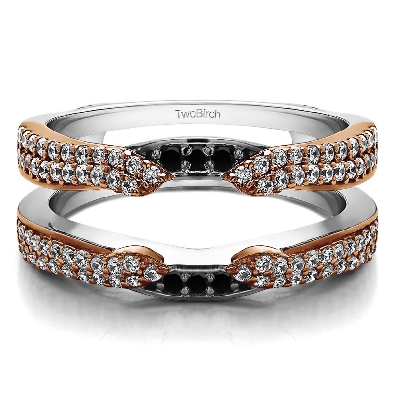 This wedding ring guard has 94 round, prong set stones. Each band measures 2.22 millimeters wide. This ring guard has 0.5 carats total weight. It is made to fit a round solitaire from 0.5 carats to 1.5, or a princess cut solitaire from 0.5 up to 2, or a marquise solitaire from 0.75 up to 1.5 carats.