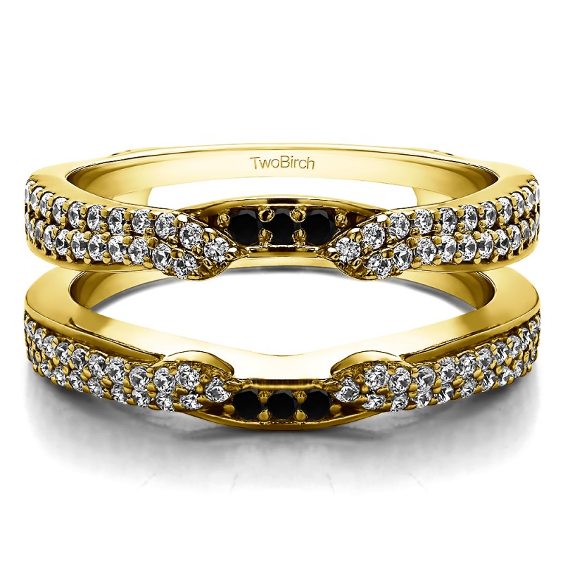 This wedding ring guard has 94 round, prong set stones. Each band measures 2.22 millimeters wide. This ring guard has 0.5 carats total weight. It is made to fit a round solitaire from 0.5 carats to 1.5, or a princess cut solitaire from 0.5 up to 2, or a marquise solitaire from 0.75 up to 1.5 carats.