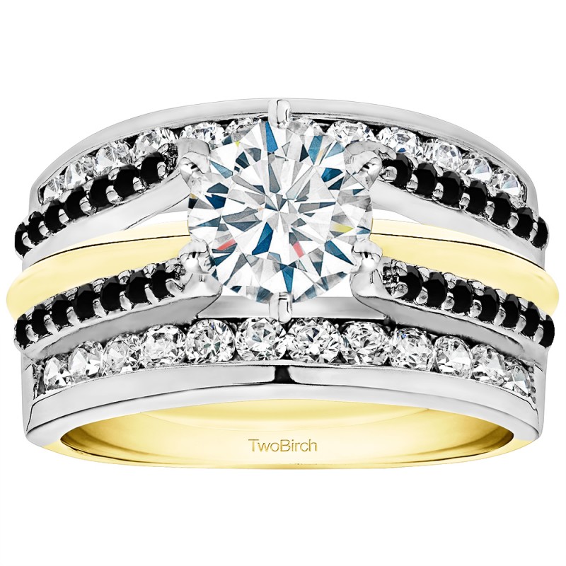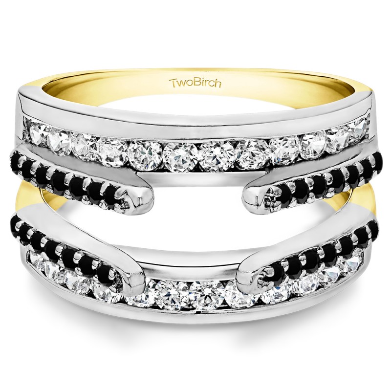 This wedding ring guard has 58 round, channel set stones. Each band measures 2.6 millimeters wide. This ring guard has 0.5 carats total weight. It is made to fit a round, princess or marquise cut solitaire from 0.5 carats to 1 carat.