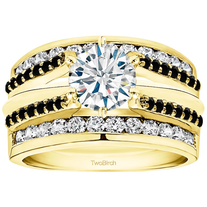 This wedding ring guard has 58 round, channel set stones. Each band measures 2.6 millimeters wide. This ring guard has 0.5 carats total weight. It is made to fit a round, princess or marquise cut solitaire from 0.5 carats to 1 carat.