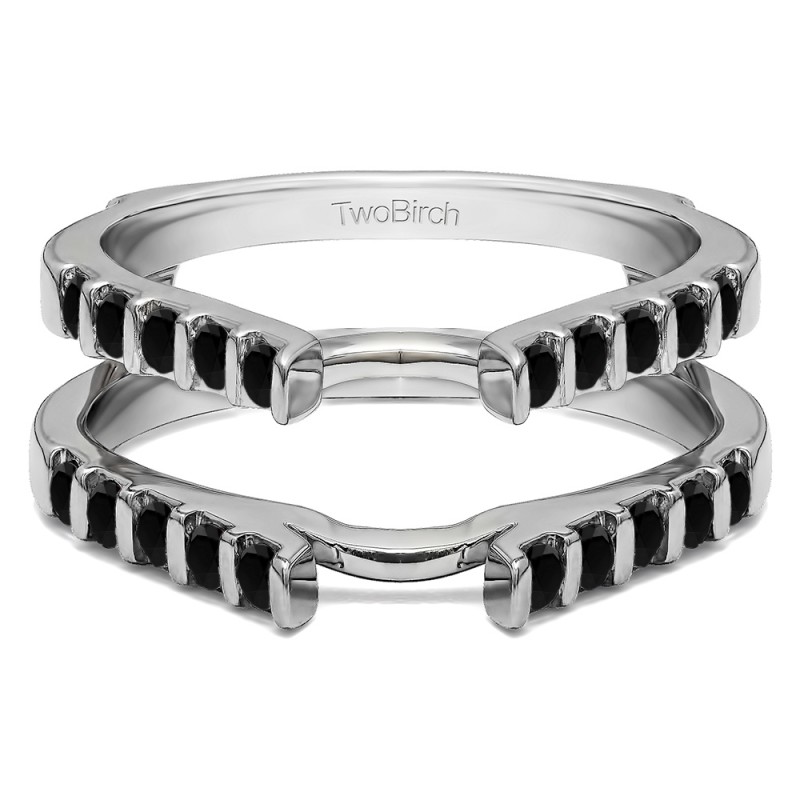 This wedding ring guard has 20 round, bar set stones. Each band measures 2 millimeters wide. This ring guard has 0.5 carats total weight. It is made to fit a round or princess cut solitaire from 0.5 carats to 2, or a marquise solitaire from 0.5 up to 1.5 carats.