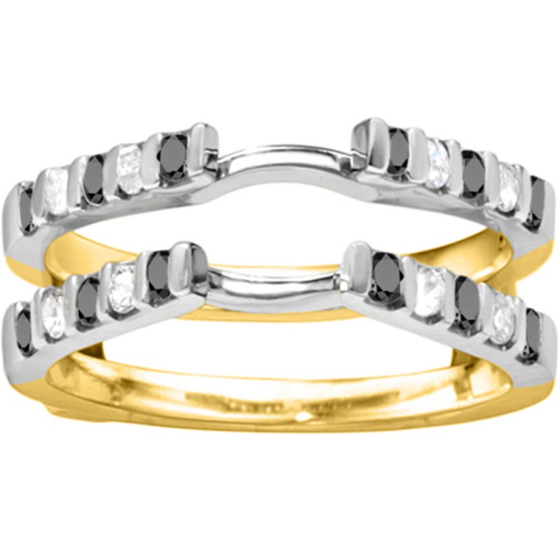 This wedding ring guard has 20 round, bar set stones. Each band measures 2 millimeters wide. This ring guard has 0.5 carats total weight. It is made to fit a round or princess cut solitaire from 0.5 carats to 2, or a marquise solitaire from 0.5 up to 1.5 carats.