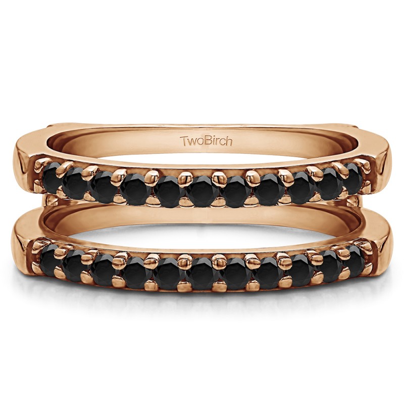 This wedding ring guard has 22 round, prong set stones. Each band measures 2.6 millimeters wide. This ring guard has 0.51 carats total weight. It is made to fit a round solitaire from 0.5 carats to 0.75, or a princess cut solitaire from 0.25 up to 0.5 carats.
